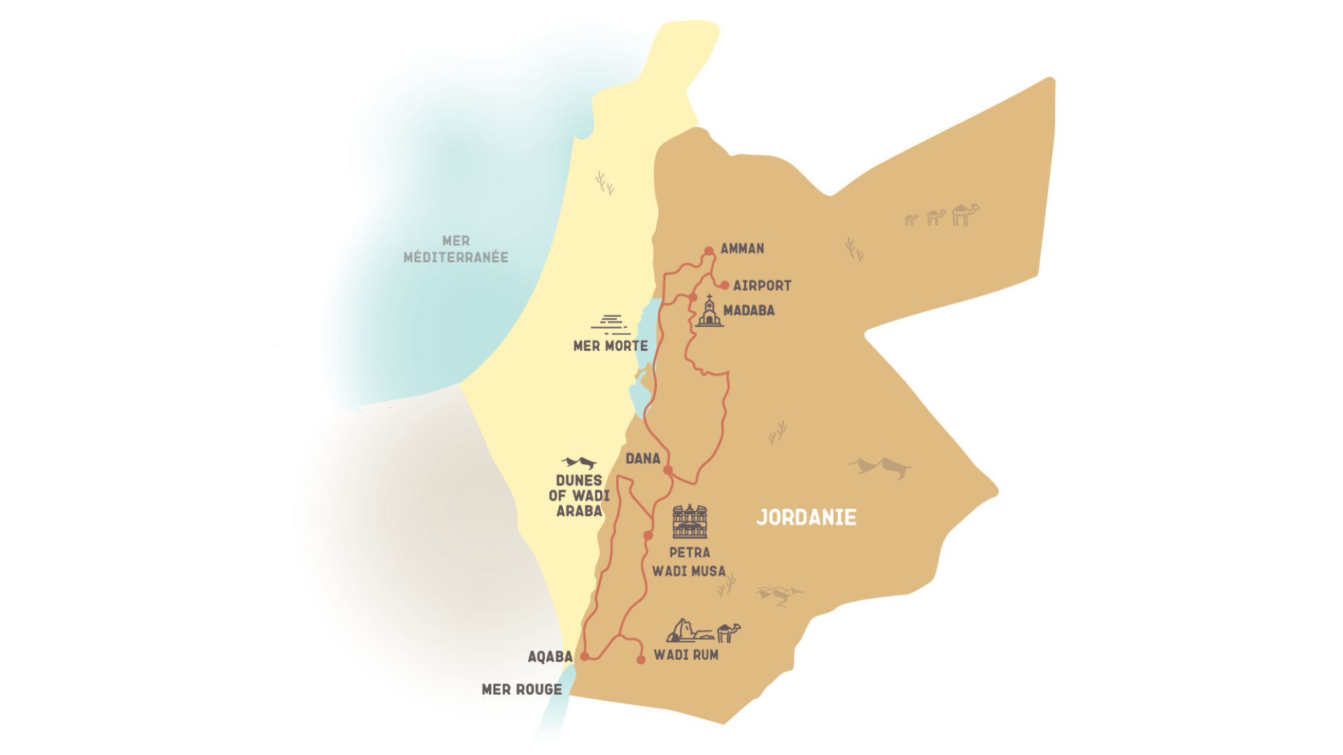 - Lieux incontournables : Amman, la mer Morte, le désert du Wadi Rum, Petra, la mer Rouge, Madaba