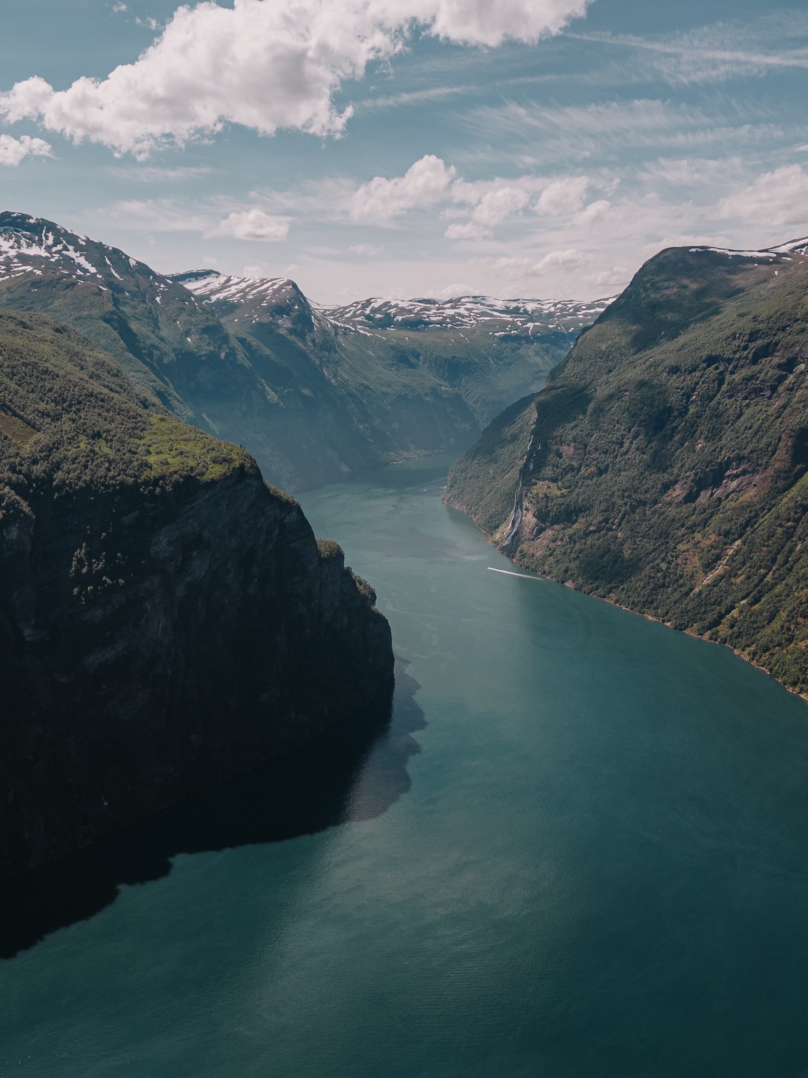 Les célèbres cascades des « Sept Sœurs » (250 m de haut) se dressent face au « Prétendant », créant un dialogue éternel entre ces géants d’eau. La route en lacets vers Dalsnibba (1476m) vous offre des points de vue vertigineux sur cette merveille géologique.