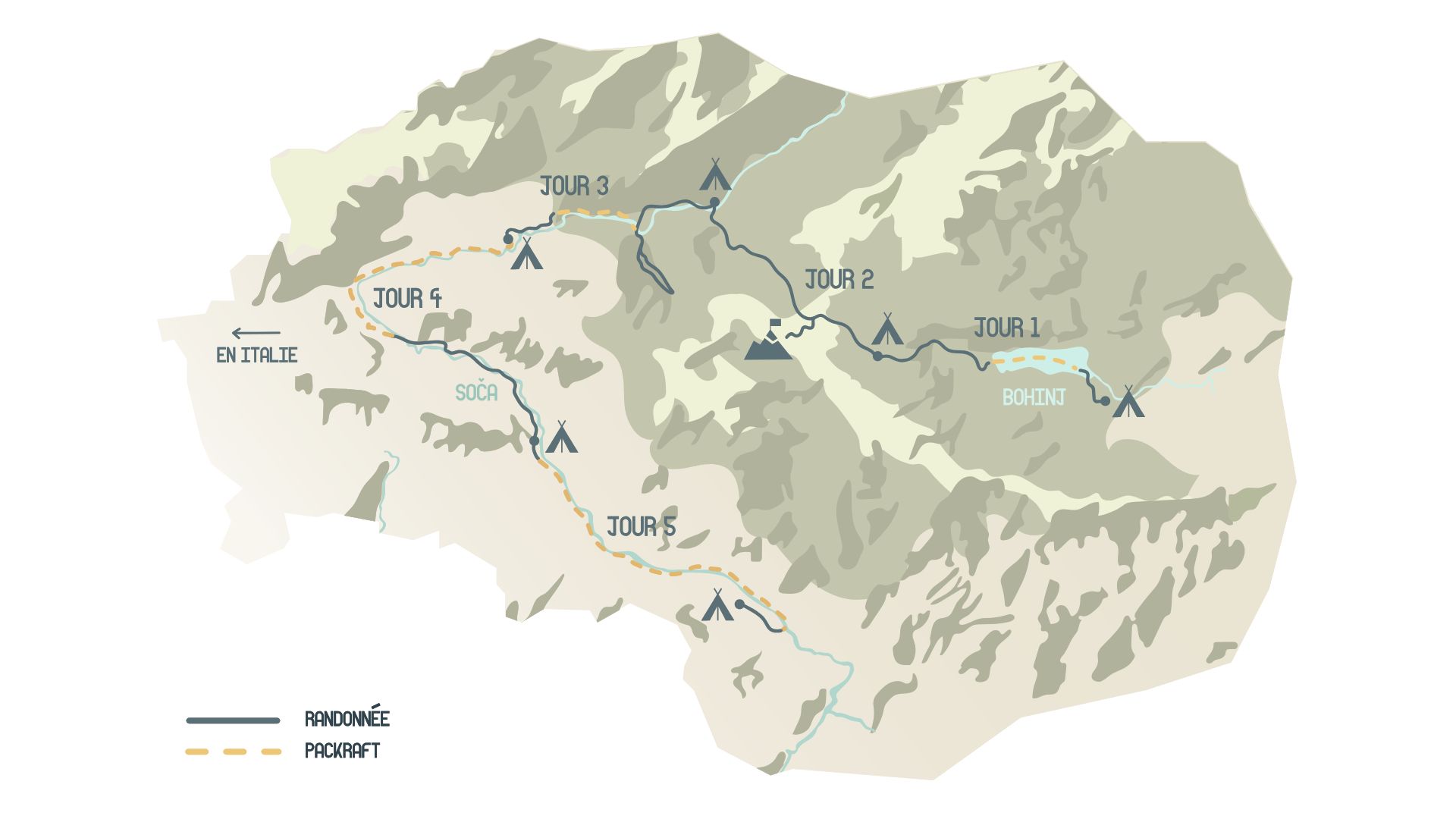 Cette étape constitue la grande traversée du massif du Triglav, parc national et cœur de l’identité slovène. Une randonnée de 13,5 km vous fait découvrir des paysages alpins encore préservés du tourisme de masse : plateaux karstiques, crêtes rocheuses et vallées sauvages se succèdent. Cette étape, moins exigeante que la veille avec seulement 340 mètres de dénivelé positif, permet de profiter pleinement des panoramas et de la quiétude des lieux. Les plus aventurier·ères peuvent opter pour un détour vers un sommet annexe pour admirer une vue à 360° sur l’ensemble du massif (option : 17 km et 550 m D+). La descente progressive de 1330 mètres vous mène vers la vallée de la Soča, où vous installez votre campement au bord de la légendaire rivière émeraude. Ce premier contact avec la Soča est un moment magique qui marque le basculement de votre aventure vers sa dimension aquatique.